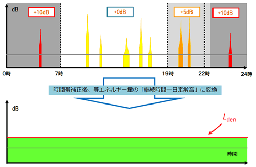 一日分のLeqに対して(5)の時間帯補正を行って得られる値。