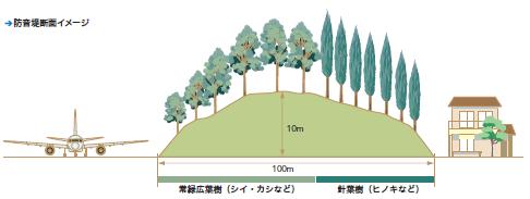 航空機が滑走路走行時などに発する騒音影響を軽減するため、空港周囲には防音堤や防音林の整備を進めています。幅100m、高さ10m の防音堤の場合、その外側では、騒音値がおおむね10dB 低減されます。