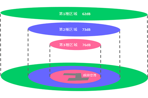 空港周辺の騒音対策を実施するため、騒防法(公共用飛行場周辺における航空機騒音による障害の防止等に関する法律)により航空機騒音評価指標値(Lden)ごとに以下の騒音対策区域が指定されています。
