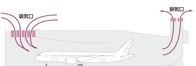 この施設を使用することで、400m離れた空港境界付近では、人の話し声と同等の60dB(A)以下にまで低減させることができます。