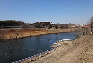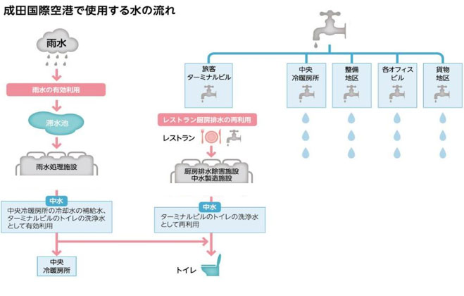 空港に降った雨の大部分は、空港内に設置された滞水池に貯められます。その一部は雨水処理プラントで再利用水をつくり、空港内の冷暖房装置の冷却水として活用し、上水(水道水)の使用量の節約に貢献しています。