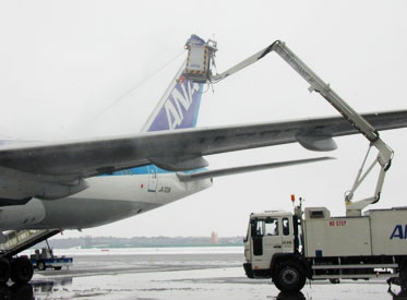 冬の低温時や降雪時に、航空機の翼などに氷や雪が付くと、翼に対する空気の流れが変わったり、操縦性能に影響を与えます。重大な事故を防ぐために、航空機の主翼や尾翼に防除氷剤を散布する作業を「ディアイシング(De-Icing)」といいます。